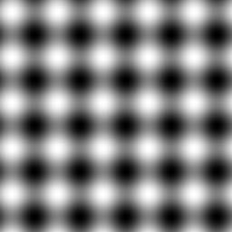 By adding many of these functions together (all with different sizes, center points, etc...), and using a better color palette than the boring greyscale used here, you can generate plasmas. To warm up, here's already a real plasma, which is the sum of 2 sine functions: